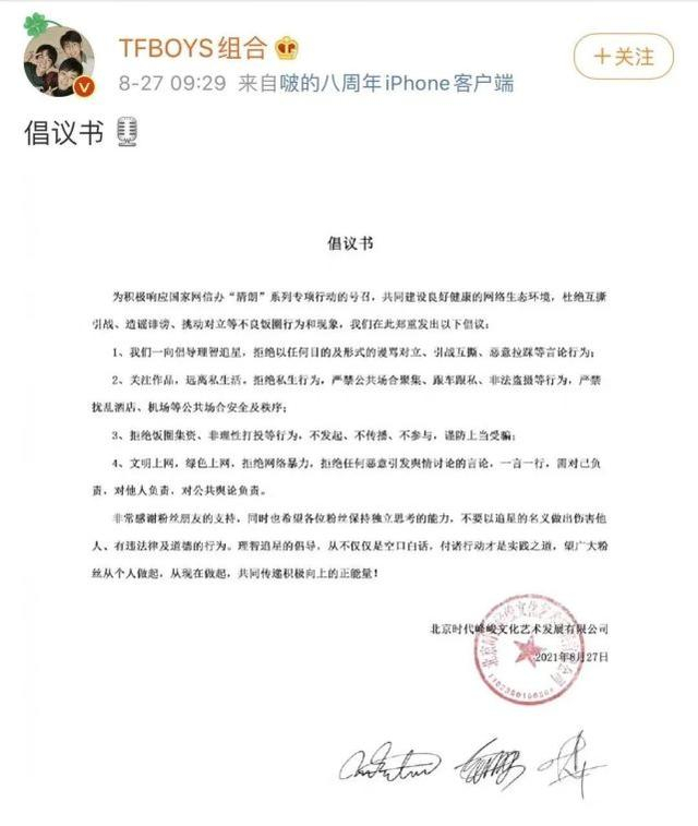 TFBOYS组合、李易峰工作室也发布倡议书,号召粉丝关注作品,远离私生活。