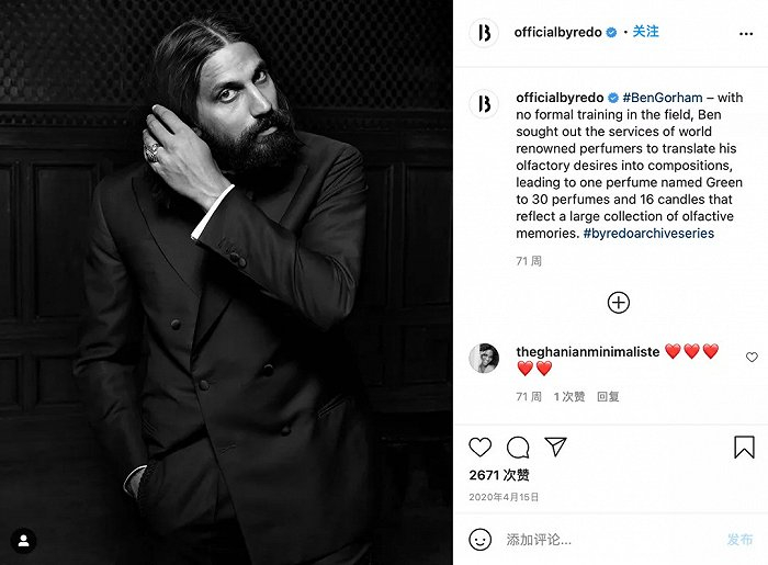“2006年,由印度裔加拿大籍创始人 Ben Gorham(时年29岁)创立于斯德哥尔摩,Byredo 是一个欧洲奢侈品牌,其愿景在于通过产品和体验来阐释记忆和情感。Byredo 正通过全新的方式来重塑奢侈品世界,在这里,情感主导整个创作,呈现出一个完整且不受限的品牌宇宙。”