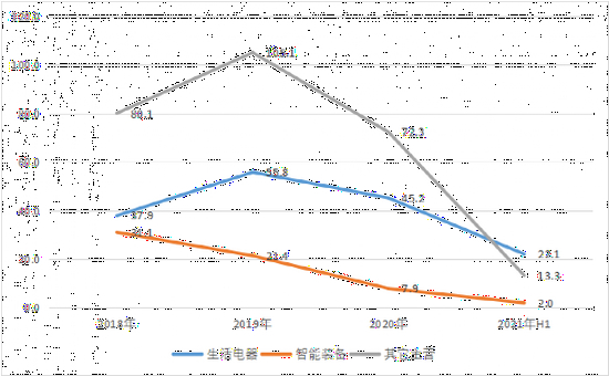2021年上半年,格力的生活电器业务实现收入22.1亿元,同比下滑0.38%;智能装备业务实现收入2亿元,同比下滑5.44%。这已经是它们连续第三年下滑了。
