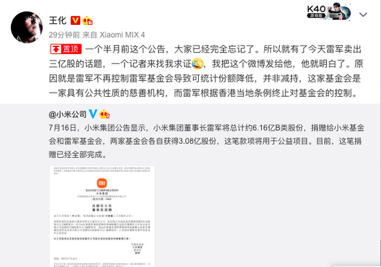 新浪科技讯 9月3日晚间消息,小米集团公关部总经理王化就雷军今日卖出逾3亿股小米股份,通过其个人微博回应称:“雷军不再控制雷军基金会导致可统计份额降低,并非减持,这家基金会是一家具有公共性质的慈善机构,而雷军根据香港当地条例终止对基金会的控制”。