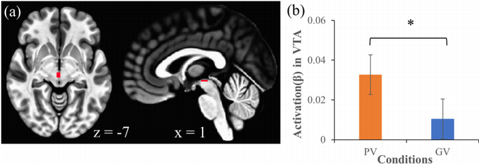 (a)腹侧被盖区在MNI脑模板上的位置。(b)相较一般视频,在观看算法推荐的视频时,腹侧被盖区的活跃程度显著更强 — 参考文献[4]人的认知能力会因此受到影响吗?