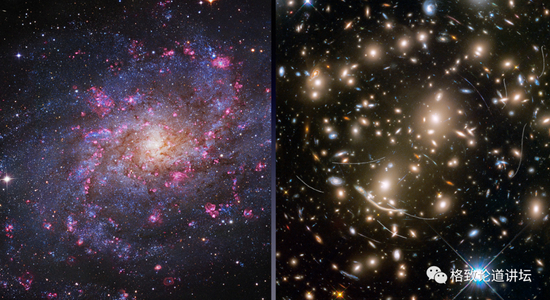 但是,我们去看右图哈勃望远镜拍到的这张图片,里面的星云分解成了一颗一颗的恒星。我们能知道它们的亮度,颜色。可以来推断这样的一个星系是如何形成的。
