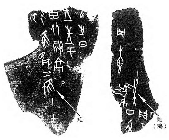 只有公元前3000-700年的河南省先王岗遗址,以及公元前2300-1900年的山西省周家庄遗址出土的禽类遗骨,比较符合家鸡的解剖学特征。另外,河南省安阳市殷墟遗址出土的公元前1300年左右的家鸡遗骨,也获得考古学家认可,而且该遗址出土的甲骨文中“雉”和“鸡”写法已明显区分。由此推断,中国饲养家鸡的历史至少有3300年。