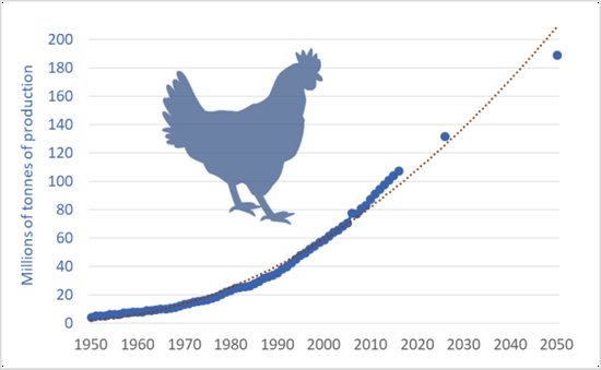 全球鸡肉产量变化(左,FAO)和美味的烤鸡(右,Pixabay)