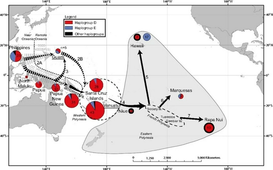 线粒体DNA进行测序分析表明,大约3850年前,家鸡在密克罗尼西亚和新几内亚岛屿之间随着人类的迁徙而扩散,在之后数千年里,家鸡经由菲律宾、新几内亚、所罗门群岛、圣克鲁斯群岛、瓦努阿图岛的东迁路线,逐渐扩散到波利尼西亚群岛,进而远及北端的夏威夷岛和东端的复活节岛,即将横跨浩瀚的太平洋踏上神秘的南美洲土地。