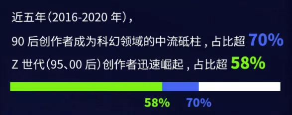 不仅规模增长迅速,科幻网文的创作者、受众人群也呈现出了明显的“年轻化”趋势:近五年90后创作者成为科幻领域的中流砥柱,占比超7成,Z世代(95后、00后)创作者迅速崛起,占比超过58%。