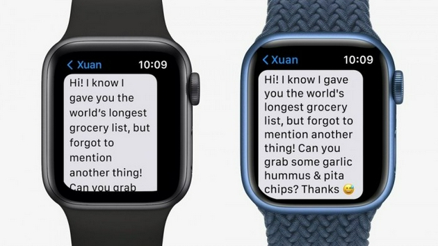 Apple Watch Series 7的设计与此前产品并没有太大不同,不过屏幕更大,其屏幕边框只有1.7mm左右,缩窄了40%。边角设计也被处理的“更柔软、更圆润”,屏幕变成了曲面屏幕,且曲面可以显示内容。与上一代Series 6相比,Series 7显示的文本内容多了50%,同时增加了全键盘输入。