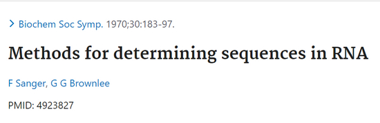 桑格一心探索核算测序方法,于1970年在Biochemical Society Symposium(IF大概在1左右)发表了相关研究“Methods for determining sequences in RNA。”。
