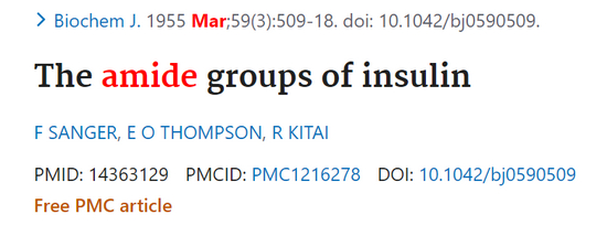 1955年,历经12年桑格完成了胰岛素测序研究工作,并将牛胰岛素的详细结构公之于众,在Biochemical Journal(IF=3.9,2021)上发表了“The amide groups of insulin”,为人们打开了认识蛋白质,认识生命的第一道大门,也为1965年人工合成结晶牛胰岛素提供了可能性。