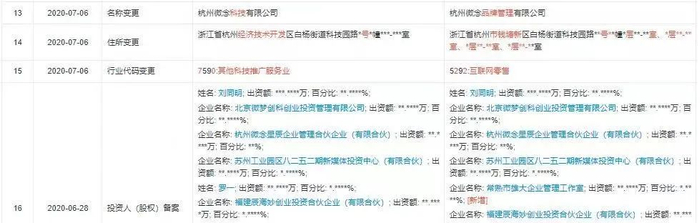 在螺蛳粉成为全网热销的单品后,微念更是顺势成立了螺蛳粉工厂广西兴柳,以70%股份位居大股东之列。而广西兴柳的董事长为微念联合创始人兼电商总监楼永建,其曾成功运营过2家几千万级店铺,1家亿级天猫店铺。2020年7月,微念甚至还将行业代码从原来的“其他科技推广服务业”变更为了“互联网零售”。