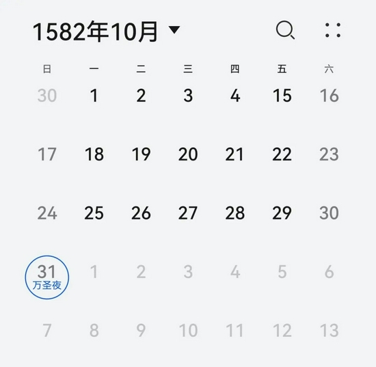 好吧,本想嘲讽一波朋友却被反嘲讽一波,小编只好乖乖打开日历,使用了这个神奇的日期跳转功能,来到了1582年的10月……