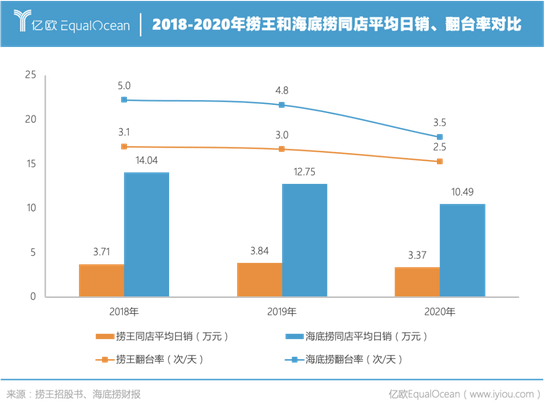 2018-2020年,海底捞的翻台率分别为5.0次/天、4.8次/天、3.5次/天,同期捞王的翻台率分别只有3.1次/天、3.0次/天、2.5次/天。