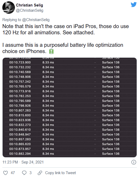 例如,如果你在iPhone 13 Pro或Pro Max上滚动浏览Twitter,你会看到流畅的滚动体验,但尚未更新到120Hz的动画被限制在60Hz,而这些动画的流畅度明显降低。这个反差问题将随着开发者在未来采用对ProMotion功能的全面支持而得到解决。