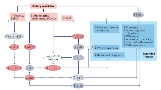 综述作者指出,目前很多西方国家的成人每天吃的蛋白数量是建议蛋白数量的两倍。过量的蛋白摄入导致体内氨基酸的水平升高,而氨基酸水平升高对前面提到的节食激发的信号通路产生相反的结果,包括mTOR复合体和FGF21的表达。