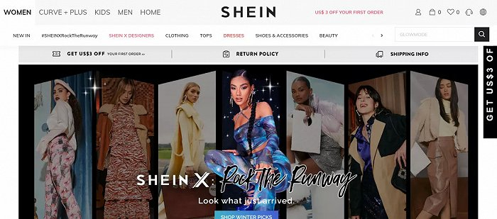 今年1月,SHEIN发起了全新设计师合作项目“SHEIN X”,这个项目旨在应对时尚行业普遍存在的侵权问题,帮助小公司和新兴设计师发展自己的品牌。在品牌官网中,我们可以看到“SHEIN X”项目是仅次于“NEW IN(新品)”、“SHEIN X ROCK THE RUNWAY”之后的第三个板块,十分醒目。