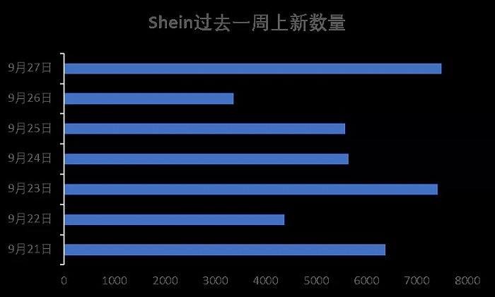 凭借着不超过20美元的标价、10天左右完成的设计和生产流程、以及日上新量超过3000件的“快时尚”速度,SHEIN已经覆盖全球220个国家和地区。据《华丽志》监测,在最近7天时间内(9月21日至9月27日),该平台新增产品数量高达 40245件。
