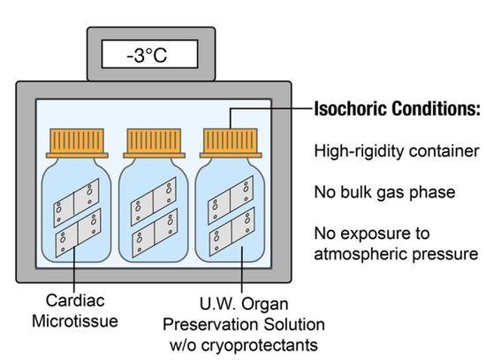 于是,科学家诱导人源性的干细胞形成心脏组织,它们能像真实的心脏那样跳动,且跳动的节律也与人类心律接近。这样的组织也称作“心脏微生理系统”(MPS)。与此同时,刚性容器里已经装满了器官保存液。把跳动着的心脏微生理系统放进容器并密封好,几乎不留气泡,就可以开始执行“等容过冷”操作了。