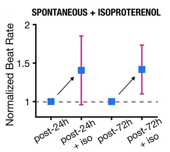 24小时后与72小时过冷后取出的心脏组织,暴露在药物中,心率有明显提升 图片来源:doi: 10.1038/s42003-021-02650-9