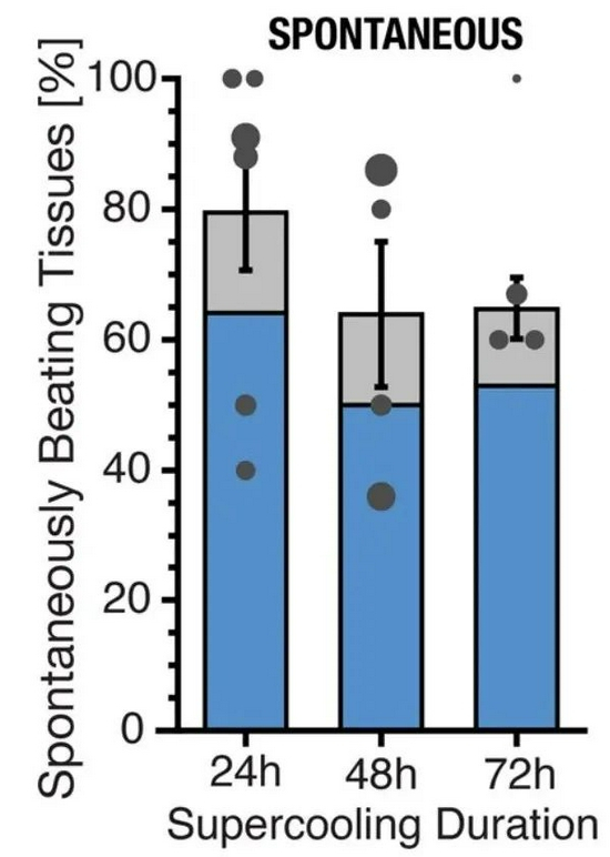 他们把容器放进-3°C的环境里,等到24小时、48小时和72小时后,分三批将组织取出,放在接近人类体温的37°C环境中,看有多少块心脏组织能够复跳。结果显示,曾经在-3°C停跳的心脏微生理系统,大多数都恢复了跳动。具体来说,24小时后取出的心脏组织样本中,有65%能恢复正常的自发搏动。48小时后和72小时后取出的心脏组织,分别有50%和55%恢复了正常的自发搏动。
