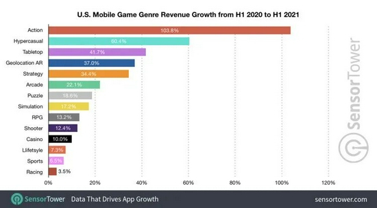 这款免费的开放世界手游还在不断创造新的纪录。根据Sensor Tower今年7月公布的数据,在美国,动作类游戏是今年上半年增速最快的手游类型,收入同比翻倍增长至4.36亿美元,其中,《原神》这款角色扮演类动作游戏贡献了最多收入,将近有1.74亿美元;App Annie也将《原神》评为今年为止仅次于《Roblox》的第二大吸金手游。