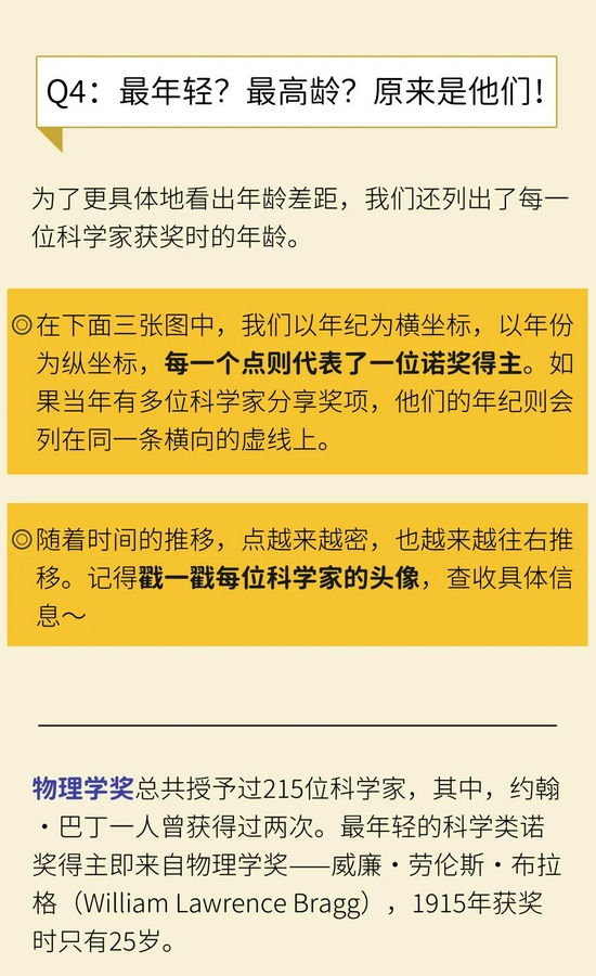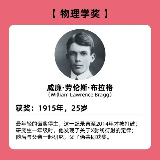 威廉·劳伦斯·布拉格25岁的最年轻纪录,或许很难再被打破。但诺奖级别的研究成果并不会因此而减少——天才科学家也好,一生孜孜不倦的学者也好,他们都在为让人类生活得更好、或是更接近真理的奥秘而努力。