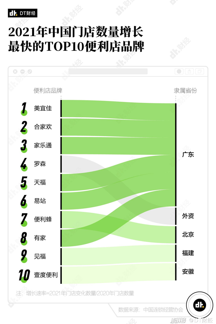 而从增速角度来看,广东的各家便利店品牌也占据了绝对的优势,在2021中国门店数量增长速度最快的十大便利店品牌中,来自广东的品牌占据了六席之多。看来在国产便利店这块,广东人是有足够的话语权的。