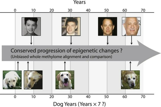 对于狗狗来说,可能它的1岁和人类的1岁相差巨大。但是狗狗的生理年龄1岁和人的生理年龄1岁却非常相近。研究者通过匹配人类和拉布拉多犬的DNA甲基化指标,推导出了一个人类年龄-狗的年龄的换算公式: