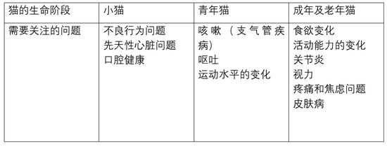在猫的不同生命阶段,猫主人需要关注的问题。| 整理自2021 AAHA/AAFP Feline Life Stage Guidelines