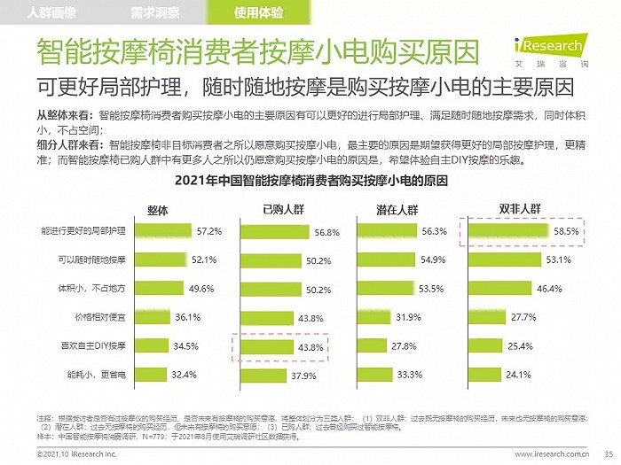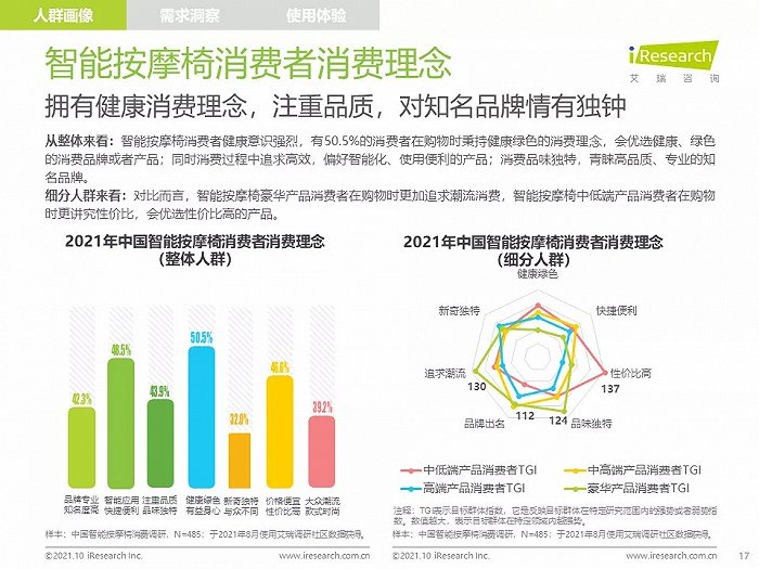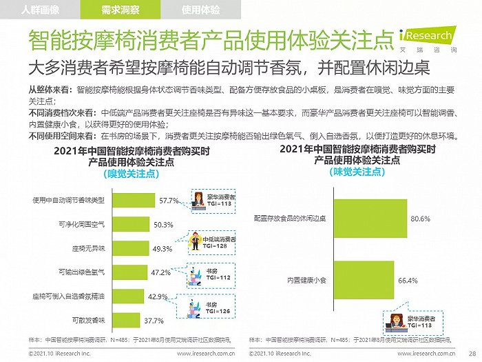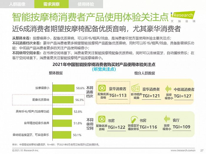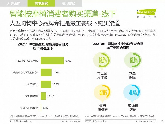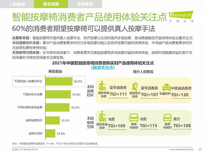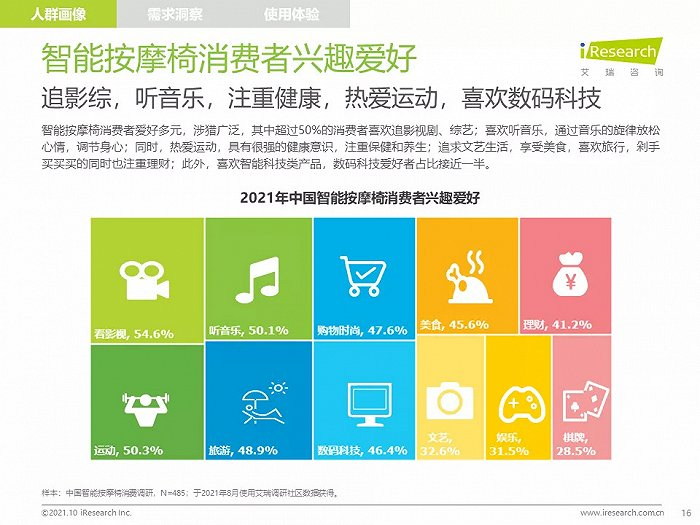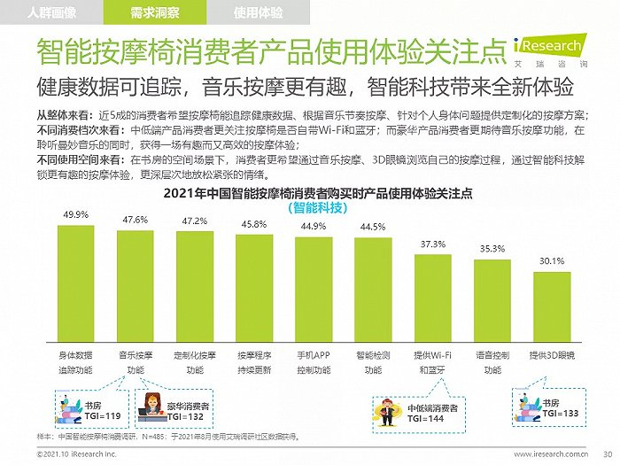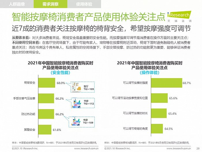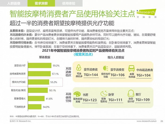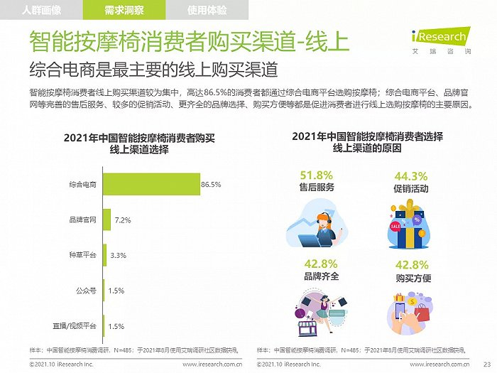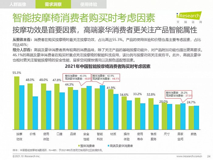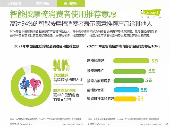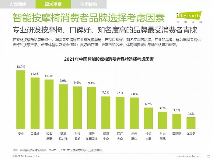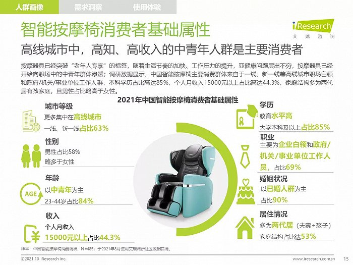 高线城市中,高知、高收入的中青年人群是主要消费者,他们拥有健康消费理念,注重品质,对知名品牌情有独钟;由于长期久坐,缺乏运动带来亚健康问题,消费者颈肩背部按摩需求强烈,也有很多消费者希望通过使用按摩椅放松舒缓身心,改善睡眠;消费者在购买智能按摩椅时,更愿意购买那些专业研发按摩椅、口碑好、知名度高的品牌产品,此外,高端及豪华消费者更喜欢智能科技感强的按摩椅产品