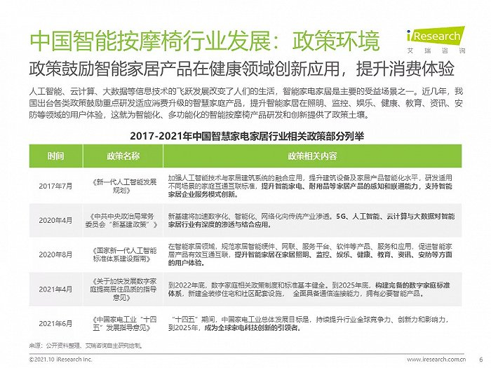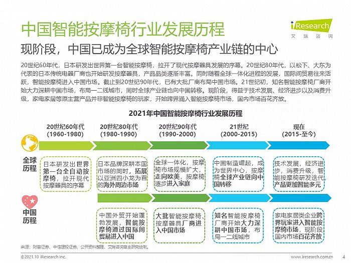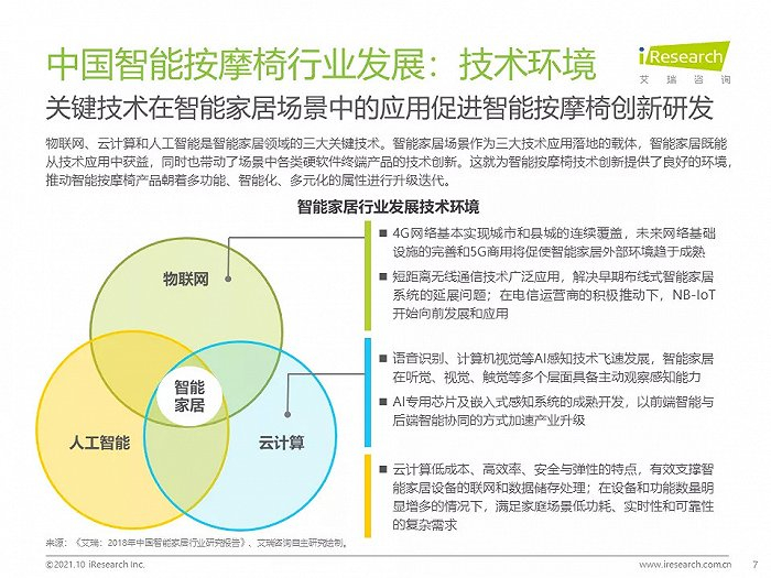 现阶段,中国已成为全球智能按摩椅产业链的中心;消费升级利好大健康发展,智能按摩椅行业迎来发展契机;智能科技在家居产品中被广泛应用,极大提升消费体验,促进相关产品创新;人口老龄化及中青年群体亚健康问题拉升智能按摩椅消费需求;关键技术在智能家居场景中的应用促进智能按摩椅创新研发
