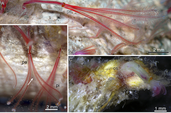 骨骸上面仿佛长出了纤细的红色小草,这是什么生物?| Rouse, G.W。 et al。 / Zootaxa (2018)