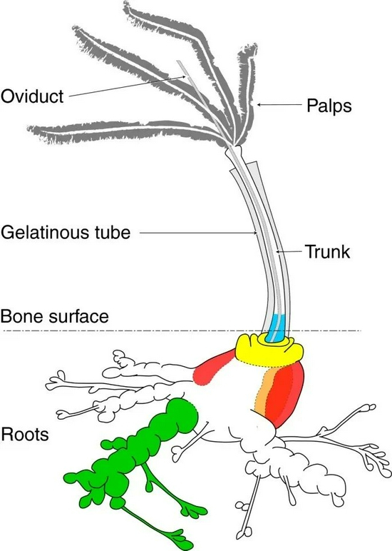 当演替经历至第二、三阶段,这座生态系统出现了些许变化。此时鲸骨表面的有机物已经基本被消耗殆尽,剩下的东西对消费者和分解者来说似乎已经没什么吸引力了。然而,某些多毛类动物(沙蚕的亲戚)并不这么认为,它们开始在鲸骨上扩散附着,与它们体内的共生菌一道相准了鲸骨内尚未被分解的充盈油脂,准备大快朵颐一番。这些多毛类动物被称作“食骨蠕虫(Osedax)”。2002年,研究人员成功在加州蒙特雷湾采得了它们的样本。