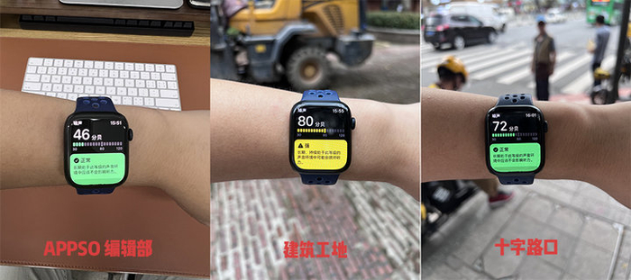 我们也使用智能手表中测试噪音的 app,在工作环境附近找了几个常见的环境进行测试,总体来说,40 分贝左右的声音不会感觉到吵,但超过 60 分贝就会让人不舒服了——至少在超过 60 分贝的环境中很难睡着觉。