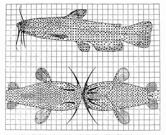 密恐预警:斑点叉尾鮰皮肤上的味蕾分布图,每个圆点表示100个味蕾,方格大小为1 cm×1 cm | 参考文献[10]
