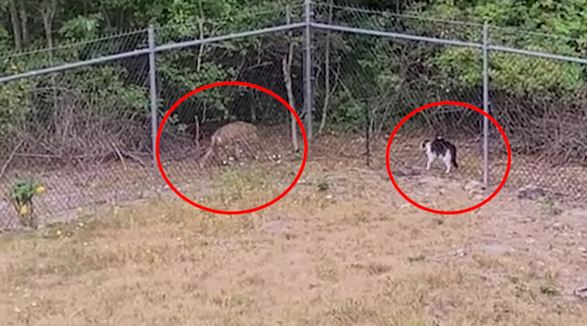 猫咪与郊狼紧张对峙 弓背“施压”突然跃起将郊狼吓跑