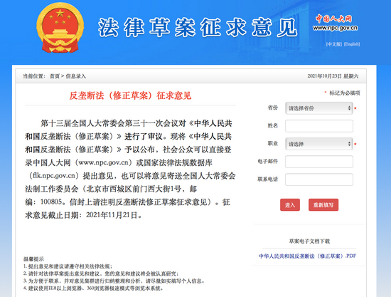 10月19日,第十三届全国人大常委会第三十一次会议对《反垄断法(修正草案)》(下称“草案”)进行初次审议。10月23日,草案内容正式公布,并向社会征求意见,2021年11月21日为征求意见截止日期。