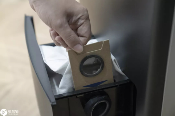 在APP端,可以设置每次回归基站自动集尘,或者手动操作。和多数具备类似功能的扫地机器人一样,X1 OMNI在集尘时噪音比较大,实测在80db左右,建议选择手动,在不影响家人休息的时候处理垃圾。 这个集尘袋的设计思路本来是挺好的,轻轻向上拉就会关闭袋口,避免灰尘散落。但注意一定要轻轻拉,因为袋口的纸壳摩擦力还是比较大的,很容易把袋口一起拉出来,掉落灰尘。