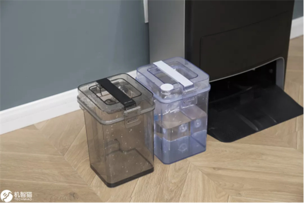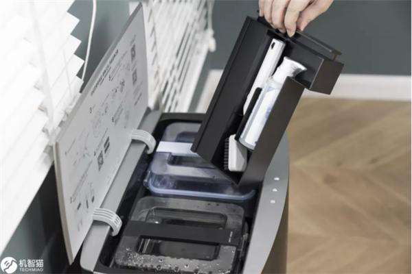 这个基站主要有自动集尘、清洗拖布、热风烘干等功能。打开顶盖就可以看到两个水箱,容积为4L,中间还有一个收纳盒,附送了清洁剂和毛刷,有效利用了内部空间,这个设计还是不错。