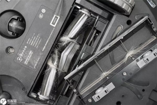 因为我家里养了小狗,细小的绒毛都藏在了V型滚刷上。打开护盖,可以看到这里的绒毛非常多,根本没能吸进尘盒,而且都是卡在铁丝网上的,很难清理。如果是大型犬,也许这个问题会更严重。 不光难于清理,X1 OMNI在工作时只会按照规划的路线走一遍,如果长毛卡住了尘盒入口,垃圾被挡在了外面,看似扫完了,但实际上只是走了一遍过场而已。 所以,如果是“掉毛女孩”或者家有宠物,一定要慎重考虑。