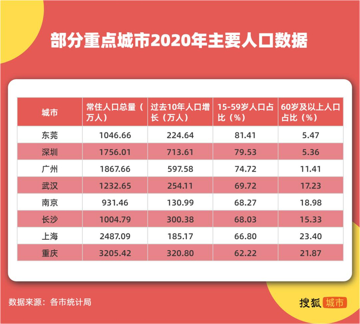 七人普数据显示,虽然广州与长沙的人口增量都极为惊人,但它们15-19岁适龄劳动人口占比却远低于东莞和深圳,60岁以上人口占比均超过了10%,已进入老龄化社会。单纯的人口增长并不意味着出生率也会随之增长,适龄年轻人口多才有可能提升出生率。