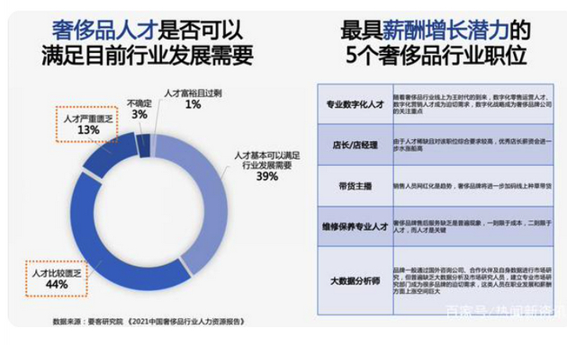 2020年,中国奢侈品行业人才缺口大约在7万人,预计2021年人才缺口将进一步扩大。奢侈品行业迎来有史以来人才缺口最大的时期,预计人才缺口超10万人,尤其是在新媒体运营、直播带货、数字化零售和高净值客户服务等领域。