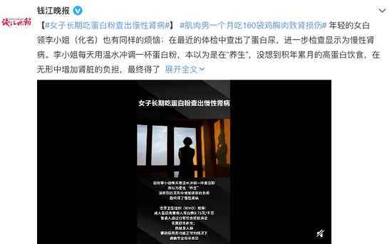 最近,有媒体报道,一位年轻的白领女士在最近的体检中查出了蛋白尿,进一步检查显示为慢性肾病。原因是她每天用温水冲调一杯蛋白粉,本以为是在“养生”,没想到积年累月的高蛋白饮食,在无形中增加肾脏的负担,最终得了慢性肾病。