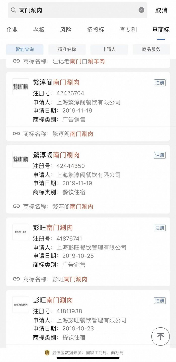 启信宝中搜索“南门涮肉”,以“×××南门涮肉”为注册名称的商标申请查到36条,但没有一家门店以“南门涮肉”申请成功。
