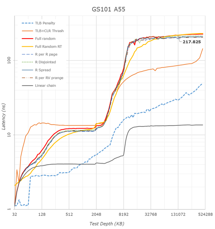 在系统缓存测试中,能看到 11-13MB 的延迟情况 (1 MB L2 + 4 MB L3 + 8 MB SLC) ,在正常的内存访问中,Tensor 也是比 Exynos 要慢的,可能和被改过的个别缓存管线有关。
