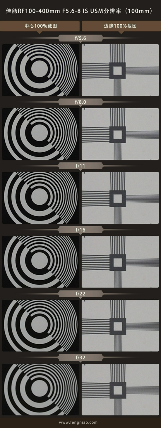 佳能RF100-400mm F5.6-8 IS USM这是佳能首次推出RF卡口的非红圈超长变焦镜头,以往我使用的佳能RF镜头综合素质都非常不错,所以对于这支售价不高并且焦段诱人的镜头来说,我还是非常期待的,下面来看看佳能RF100-400mm F5.6-8 IS USM在100mm端和400mm端各档光圈的分辨率,使用的相机为佳能EOS R6。测试方法为关闭防抖、RAW+JPEG双格式记录、光圈优先、感光度ISO 100、三脚架延时10秒拍摄,逐级调整光圈并100%截图中心和边缘。