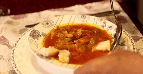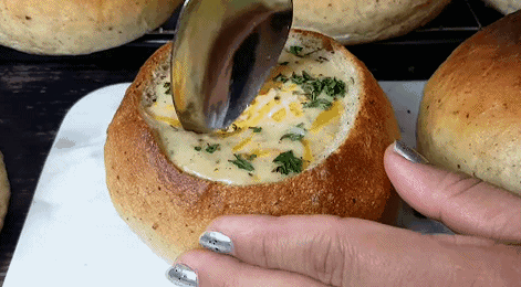 还有的吃法利用大列巴坚硬不动如山的特性,给圆形的它掏成个面包碗,里头盛上热乎乎的炖菜,一餐用罢,周围的面包也已被浸泡松软,真·好吃到碗都不剩。