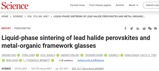 [1] Jingwei Hou et al。 Liquid-phase sintering of lead halide perovskites and metal-organic framework glasses。 Science (2021)。 DOI: 10.1126/science.abf4460