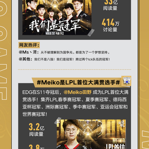 与此同时,S11期间,超话定制头衔、超话留言墙、共计超过200条优质留言成功登上官方直播赛前留言墙,夺冠当日EDG超话阅读量破2亿。