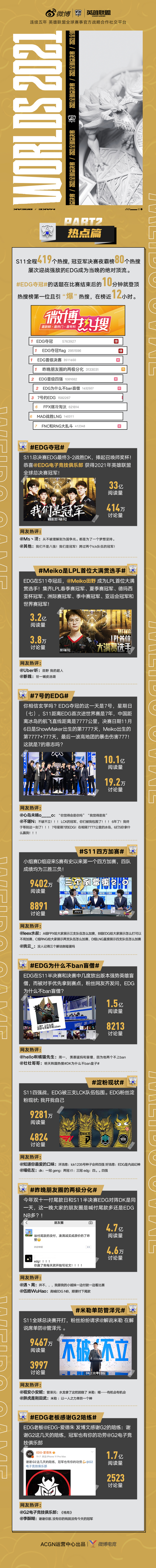 2021英雄联盟全球总决赛(以下简称“S11”)在冰岛落下帷幕,来自LPL赛区的一号种子EDG电子竞技俱乐部捧起召唤师杯,获得赛事冠军。11月16日,连续五年成为英雄联盟全球赛事官方战略合作社交平台的微博也披露了自己的成绩单。