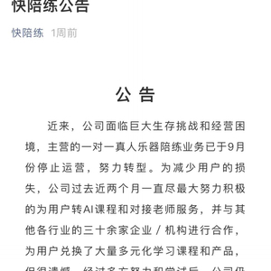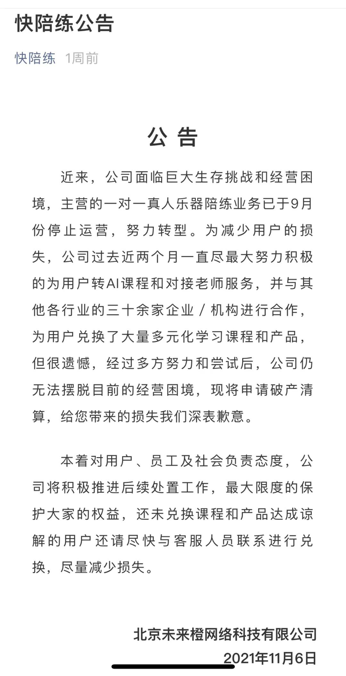 11月上旬,该平台在其官方公众号称,因面临巨大生存挑战和经营困境,主营的一对一真人乐器陪练业务已于9月份停止运营,经过多方努力和尝试后,公司仍无法摆脱目前的经营困境,现将申请破产清算。